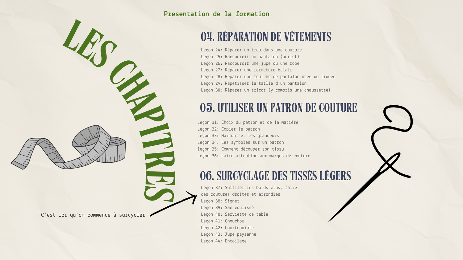 La couture permet d'économiser, d'avoir le plaisir de créer, de faire sa part dans la réduction des déchets textiles et tellement plus! Cependant s'équiper, acheter du tissu et des patrons est dispendieux aujourd'hui et vous n'avez peut-être pas le temps de vous déplacer pour suivre des cours de couture. Vous avez peut-être essayé les tutoriels mais comme ceux-ci n'offre pas une formation chronologique, il vous manque sans doute souvent des connaissances pour réaliser vos projets et si vous rencontrez un problème vous abandonnez simplement faute de ressources pour vous aider!