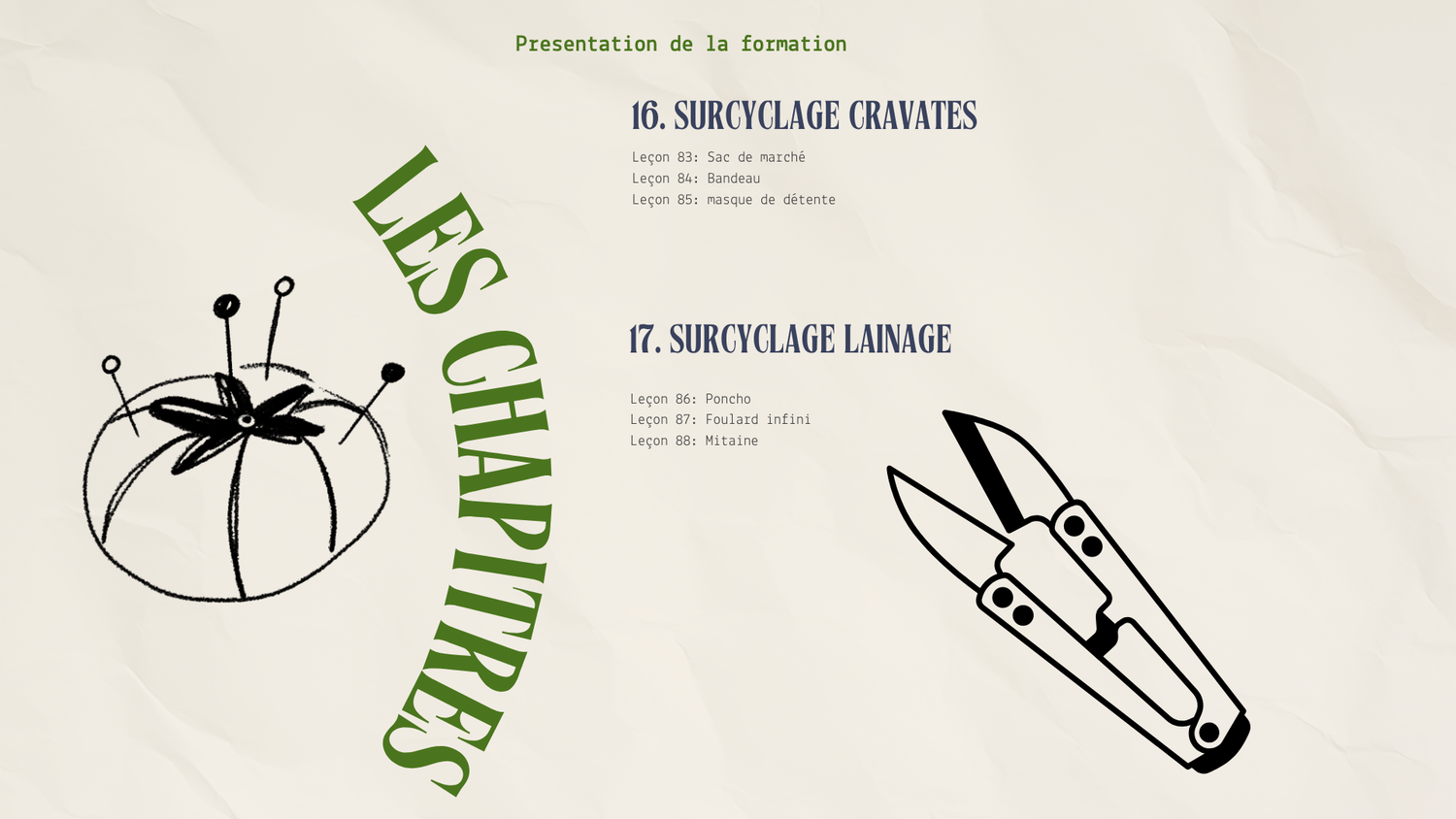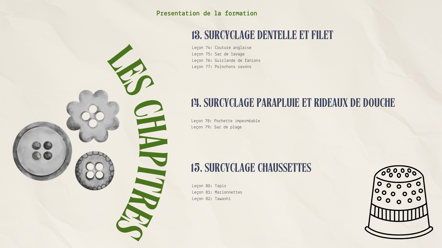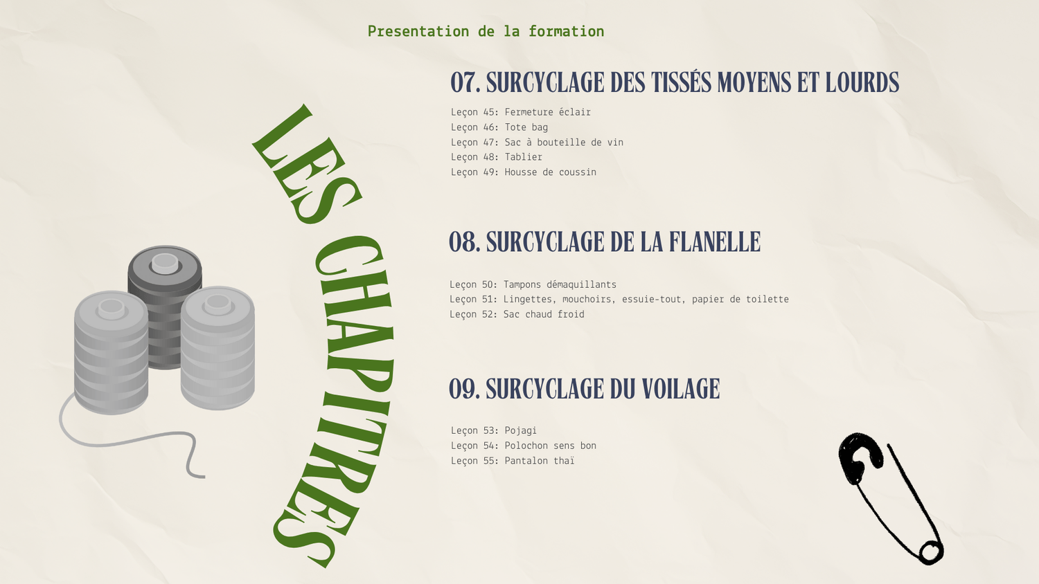 Je vous proposerai ensuite des projets pour chaque type de tissu, des tutoriels pour réaliser des vêtements, accessoires, objets de décoration. Chaque chapitre est accompagné d'une vidéo, de fichiers PDF, d'images explicatives et de ressources gratuites!